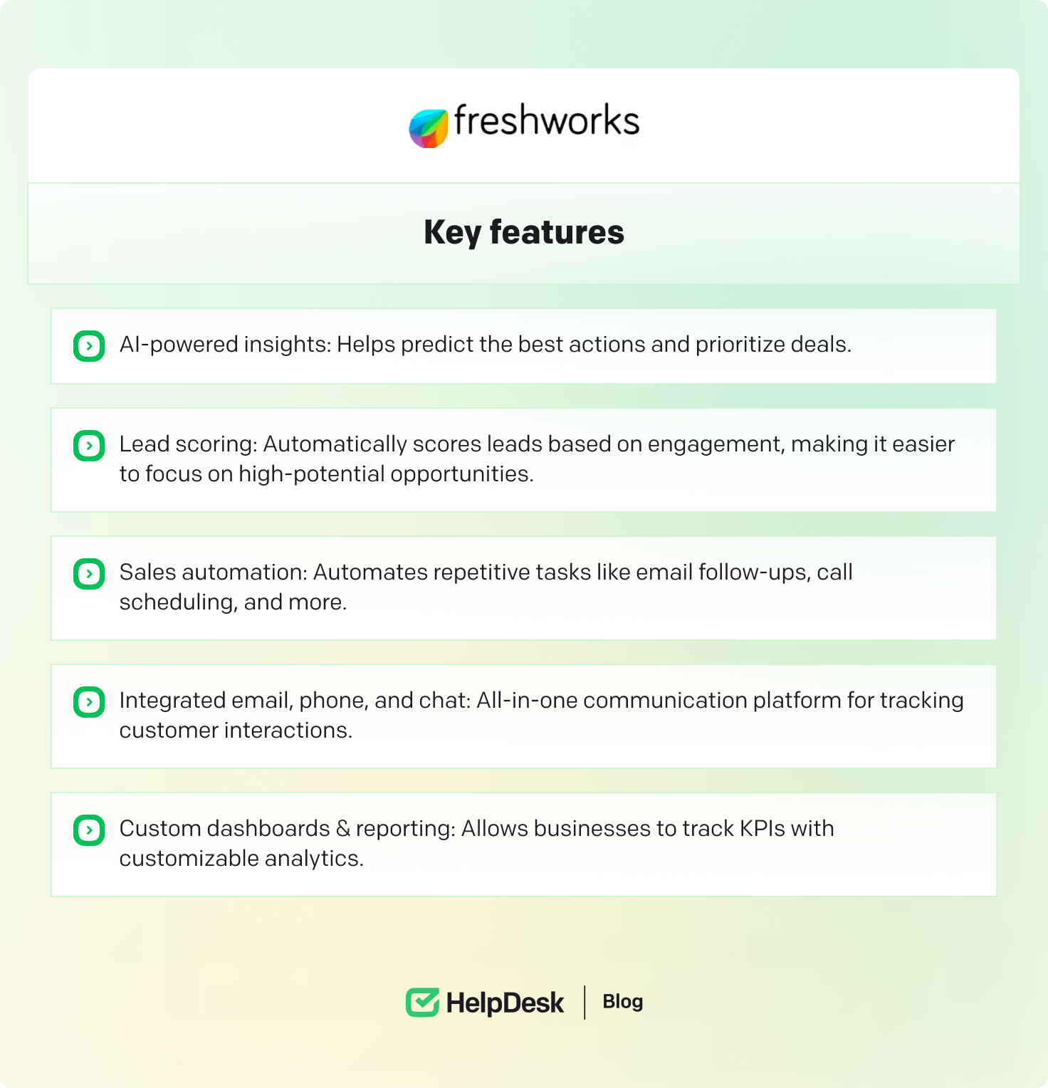 Freshworks CRM is a user-friendly customer relationship management platform designed to help businesses streamline their sales processes. It’s best for companies that want an intuitive CRM with AI-powered insights and automation to boost productivity. Freshworks CRM excels at providing sales and marketing alignment, allowing teams to manage leads, engage customers, and close deals efficiently.
