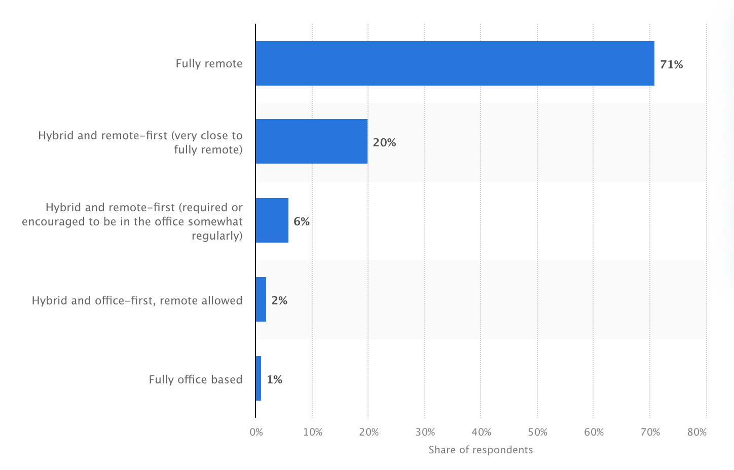 In a global survey to measure employee satisfaction in 2022, 71% of employees stated they would like a fully remote work schedule (source). At the same time, 20% preferred a work structure that was hybrid but remote-first.