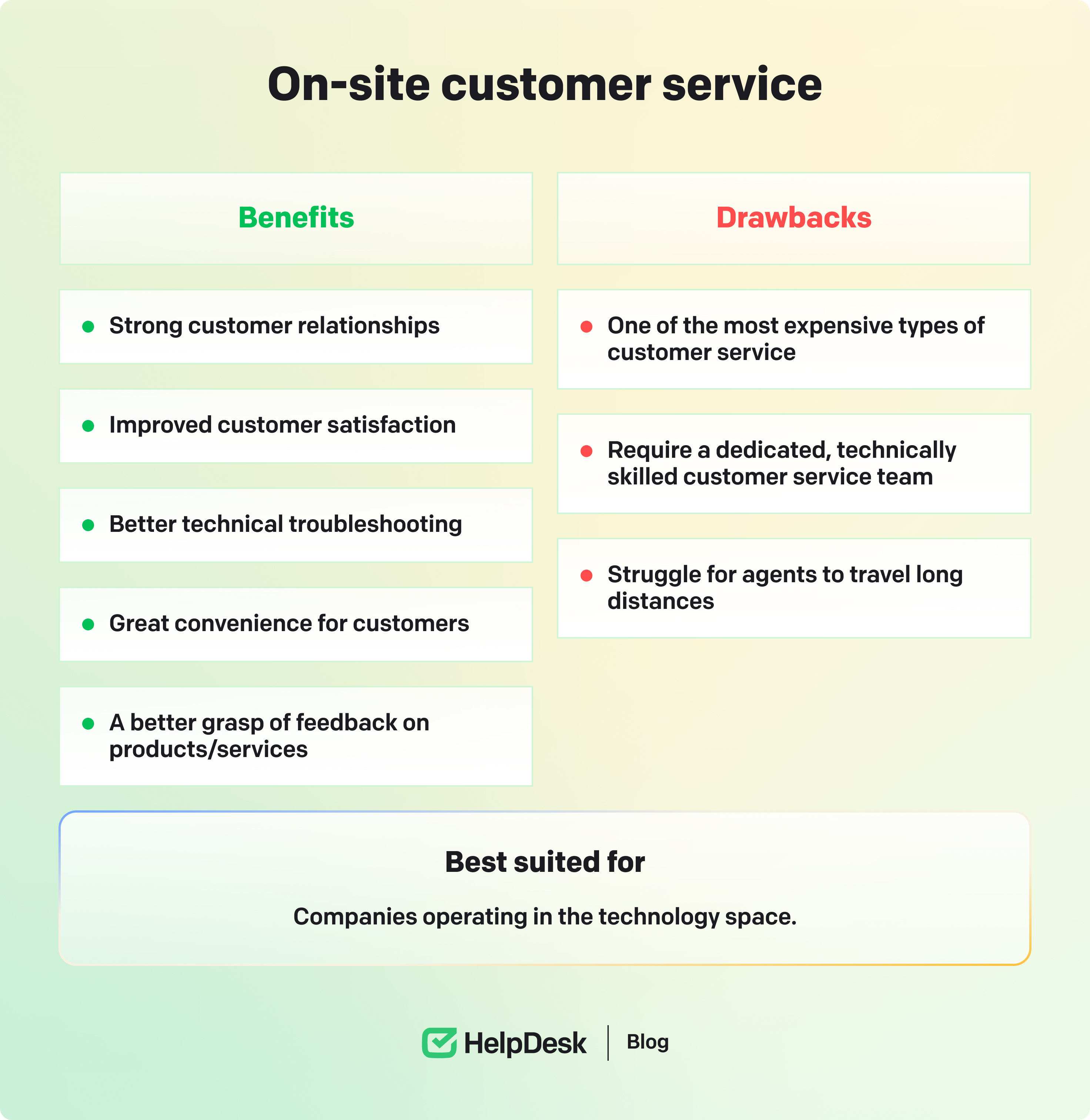 The industry you work in also influences what customer service works best. For example, ecommerce and retail businesses can find live chat, chatbots, ecommerce help desks, and social media useful, while IT companies find on-site support necessary.