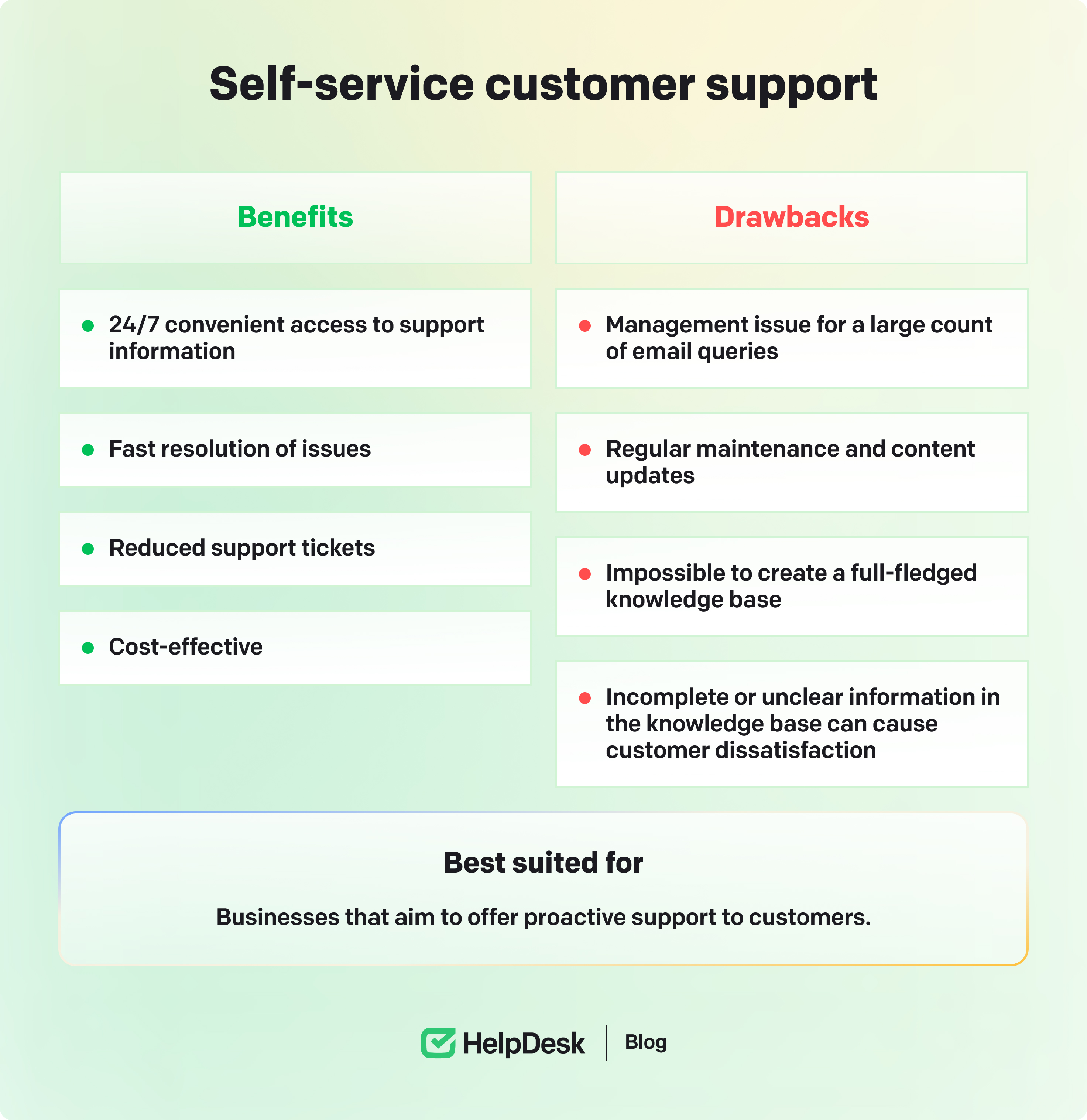 Self-service customer service also frees customer support teams from repetitive FAQ queries and lets them focus on more complex issues. Although it’s a low-cost and convenient way to provide customer support, it requires regular maintenance and updates.
